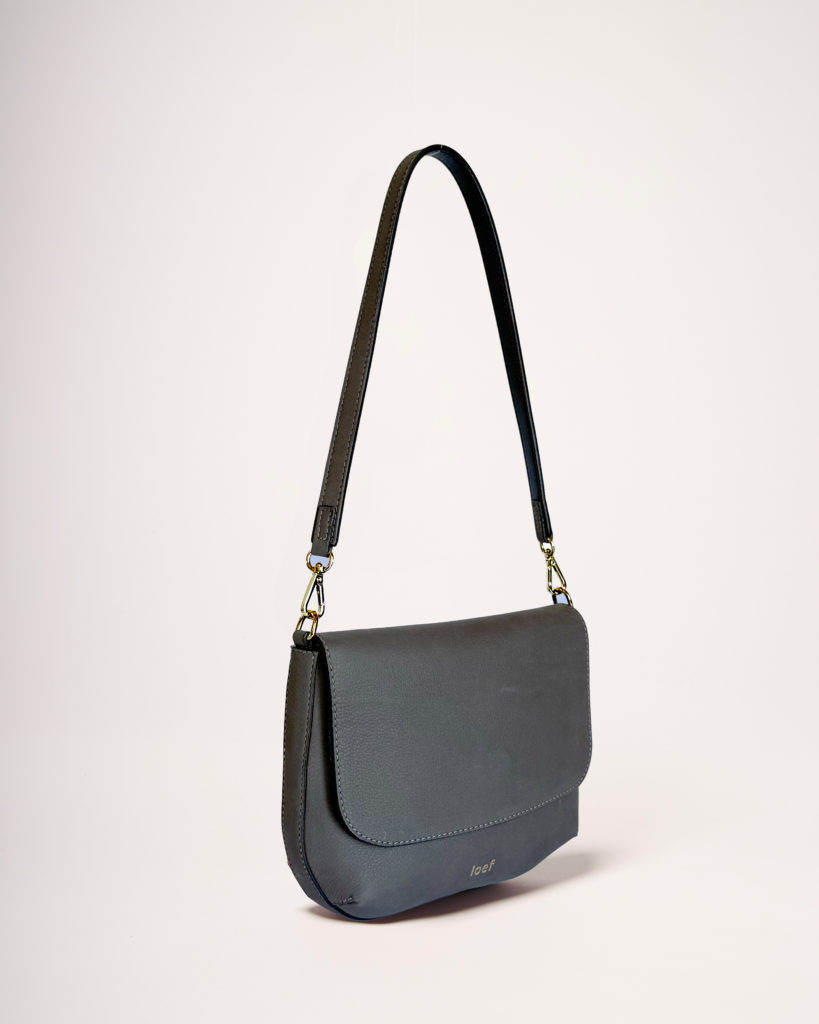 It has a minimalist shoulder or crossbody bag design, characterized by soft curves. Inside, it features a zip pocket and has a removable and adjustable strap.